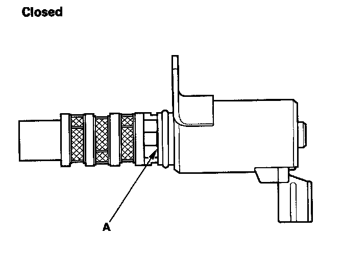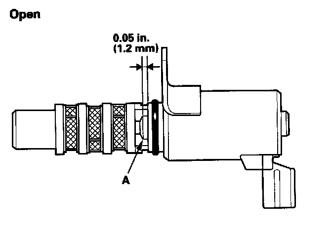 6. Connect the battery negative terminal to VTC oil control solenoid valve 2P connector terminal No. 1. Clearance (A) should be at least 1.2 mm (0.05 in.). If the valve does not open, replace it, then go to step 7.