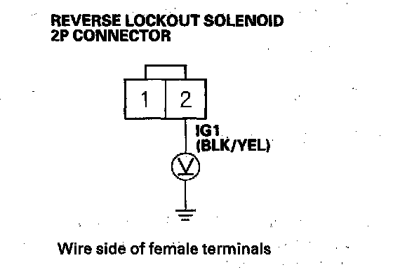 11. Measure the voltage between the reverse lockout solenoid 2P connector terminal No. 2 and body ground.