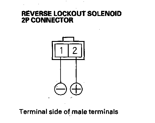 14. At the reverse lockout solenoid side, connect the reverse lockout solenoid 2P connector terminal No. 2 to the battery positive terminal, and connect the terminal No. 1 to the battery negative terminal. Make sure the reverse lockout solenoid operates.