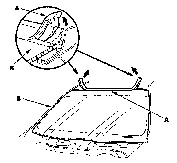 2. Remove the molding (A) from the upper edge of the windshield (B). If necessary, cut the molding with a utility knife.