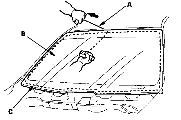 6. With a helper on the outside, pull the piano wire (A) back and forth in a sawing motion. Hold the piano wire as close to the windshield (B) as possible to prevent damage to the body and dashboard. Carefully cut through the rubber dam and adhesive (C) around the entire windshield.