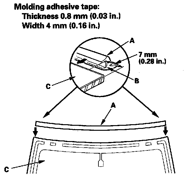 12. Attach the molding (A) with adhesive tape (B) to the upper edge of the windshield (C). Be careful not to touch the windshield where adhesive will be applied.