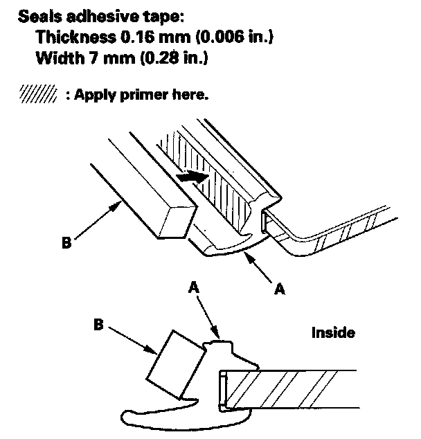 13. Apply primer to the molding (A), then attach the molding upper seal (B) with adhesive tape to the inside surface of the molding as shown.