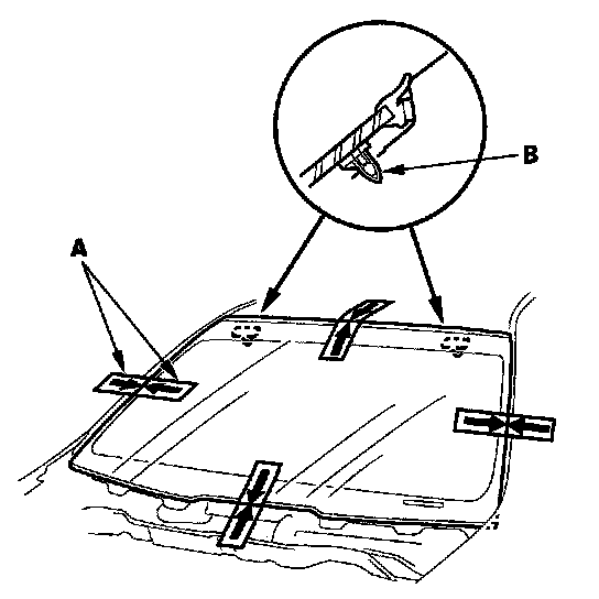 14. Set the windshield in the opening, and center it. Make alignment marks (A) across the windshield and body with a grease pencil at the four points shown. Make sure both clips (B) contact with the edge of the body holes. Be careful not to touch the windshield where adhesive will be applied.