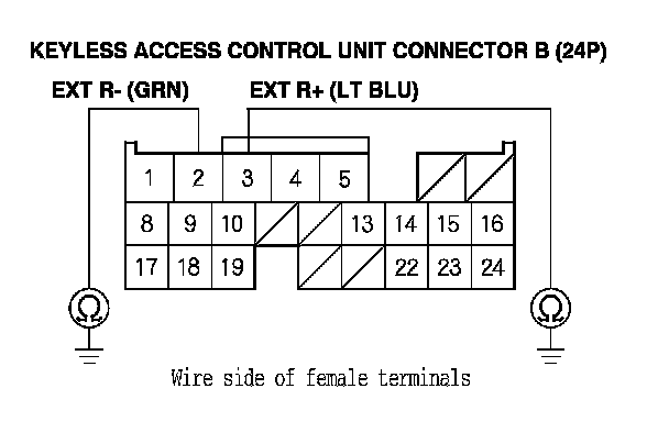 8. Check for continuity between body ground and keyless access control unit connector B (24P) terminals No. 2 and No. 3 individually.