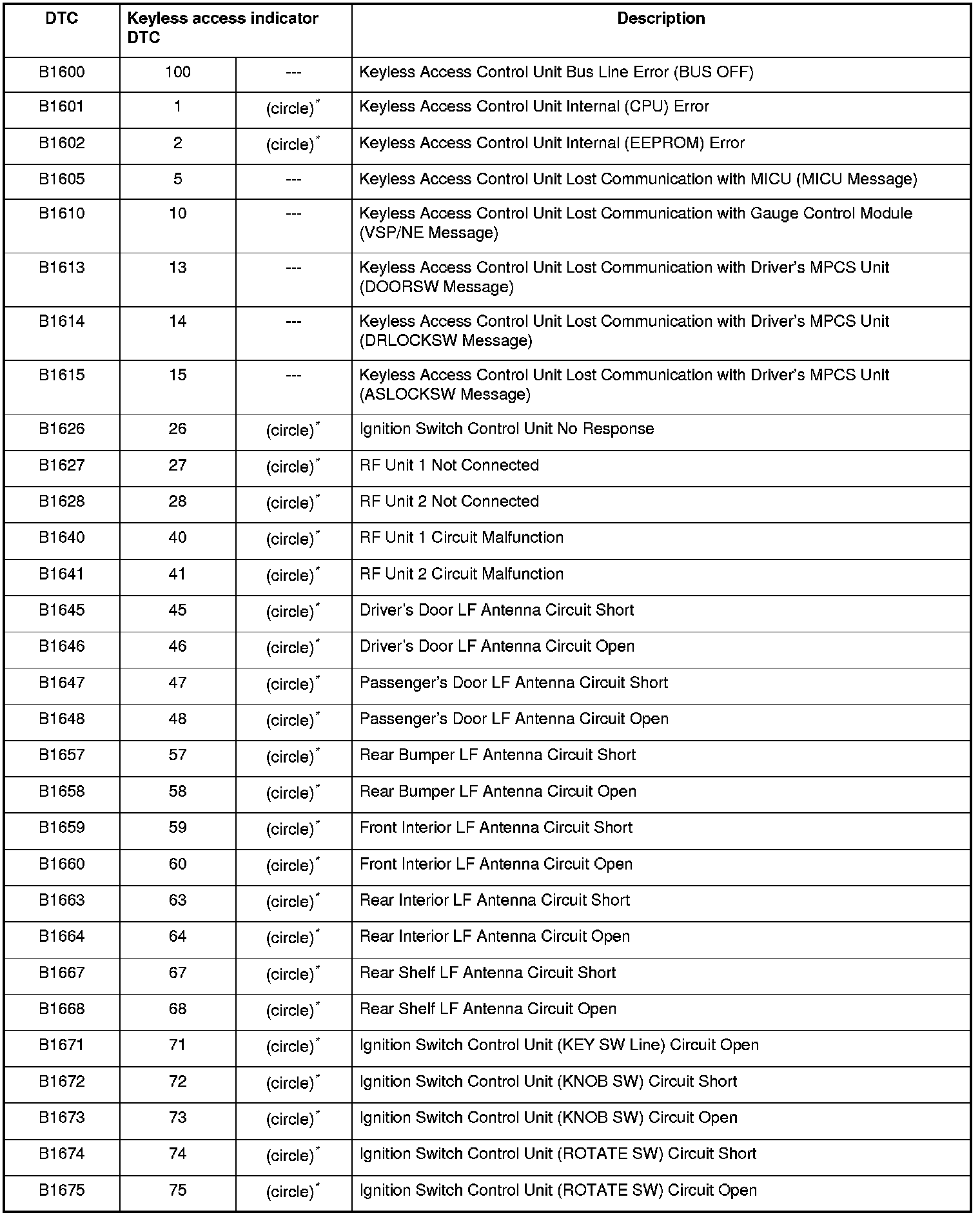 *: The keyless access indicator comes on when any malfunction is detected. With the ignition switch LOCK (0), the keyless access indicator comes on for 3 seconds when any malfunction is detected.