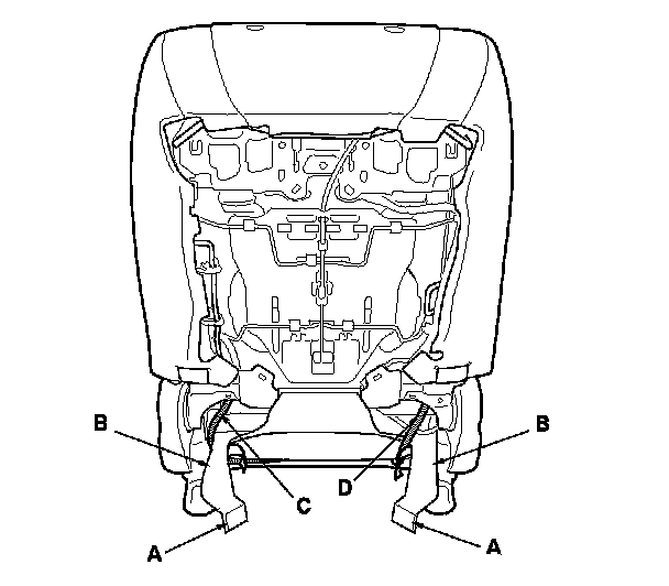 7. Release the Velcro fasteners (A), then pull back the harness holder covers (B) fastening the side airbag harness (C) and the seat wire harness (D).
