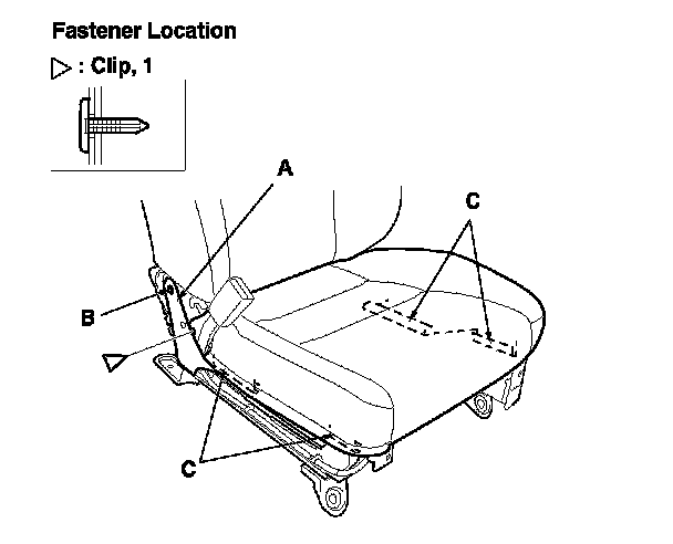 8. Remove the clip, then remove the cloth (A) of the seat cushion cover from the connecting rod (B) and release the hook strips (C) from both sides of the seat cushion frame.