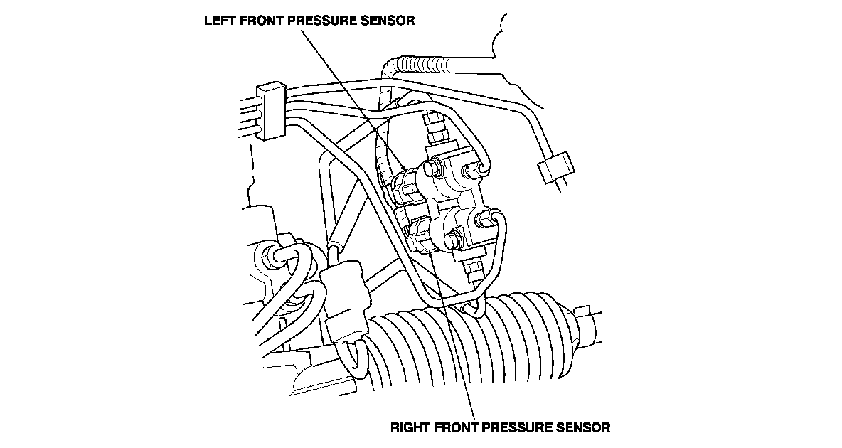 The brake fluid pressure sensors are installed in the right and left sides of the brake line 4-way joint. The brake fluid pressure is converted to a signal (voltage value) and is output to the ACC unit. The ACC unit is always monitoring the ACC brake operation and the brake pressure controlled by the signal sent from the brake fluid pressure sensor.