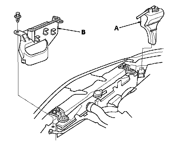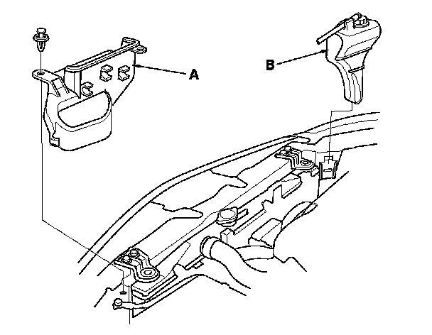 6. Install the coolant reservoir (A), and the air intake duct cover (B).
