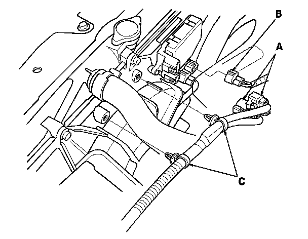 4. Remove the harness connectors (A), the ground cable (B), and the harness clamps (C).