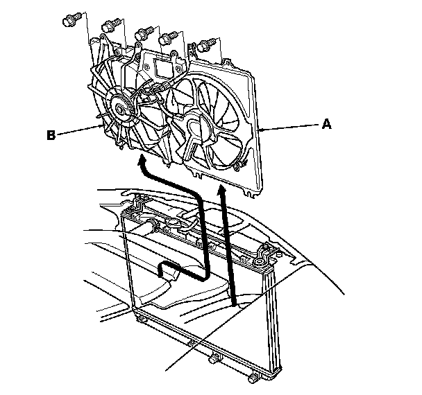 11. Remove the radiator fan shroud assembly (B) from right side of the engine compartment.