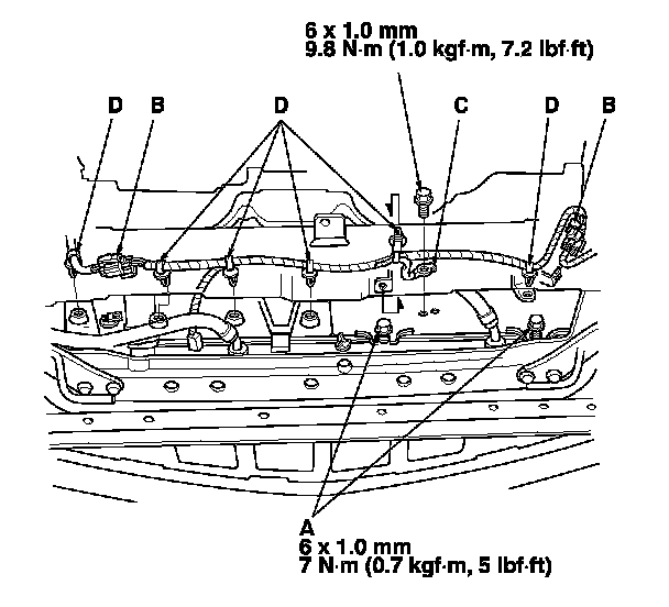 9. Install the harness connectors (B), the ground cable (C), and the harness clamps (D).