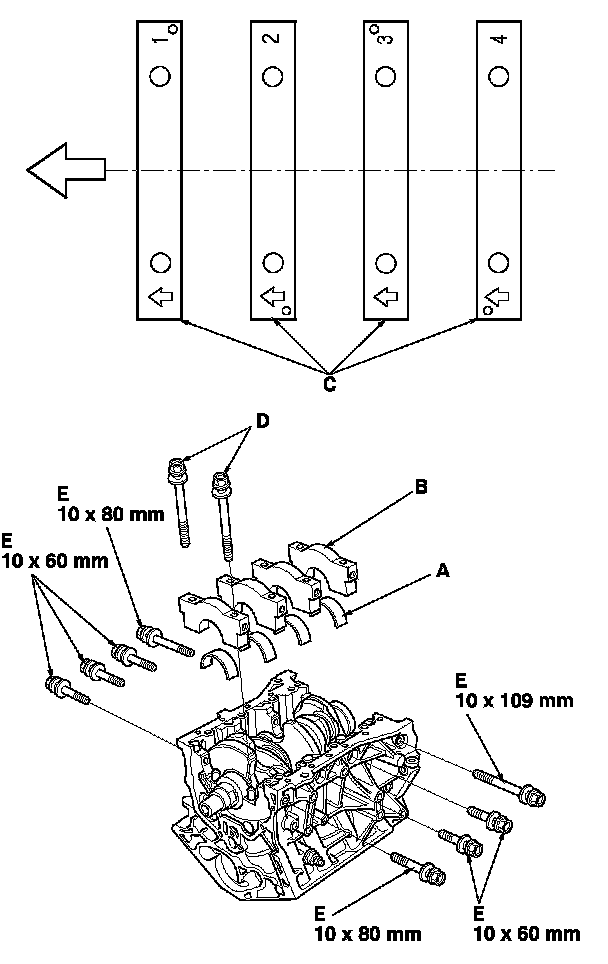 8. Apply new engine oil to the bolt threads and flanges, then loosely install the bearing cap bolts (D) and bearing cap side bolts (E).