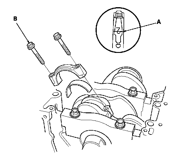 7. Install the bearings (A) and the bearing caps (B) with the arrow (C) facing the timing belt end of the engine.