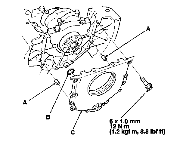 28. Install the dowel pins (A), new O-ring (B), and the engine block end cover (C) on the engine block.