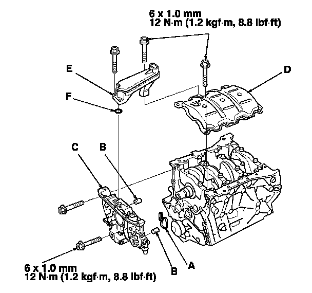 37. Install the baffle plate (D), then install the oil screen (E) with the new O-ring (F).