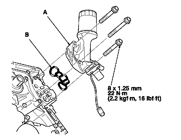 19. Apply new engine oil to the bolt threads and flanges. Torque the bolts (B) to 20 N-m (2.0 kgf-m, 14 lbf-ft).