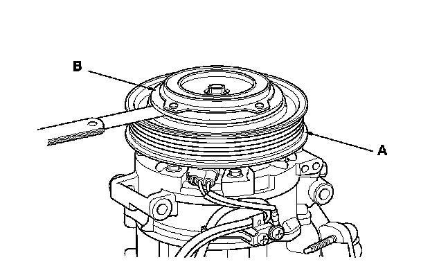 3. Measure the clearance between the pulley (A) and the pressure plate (B) all the way around. If the clearance is not within specified limits, remove the pressure plate Service and Repair and add or remove shims as needed to increase or decrease clearance.