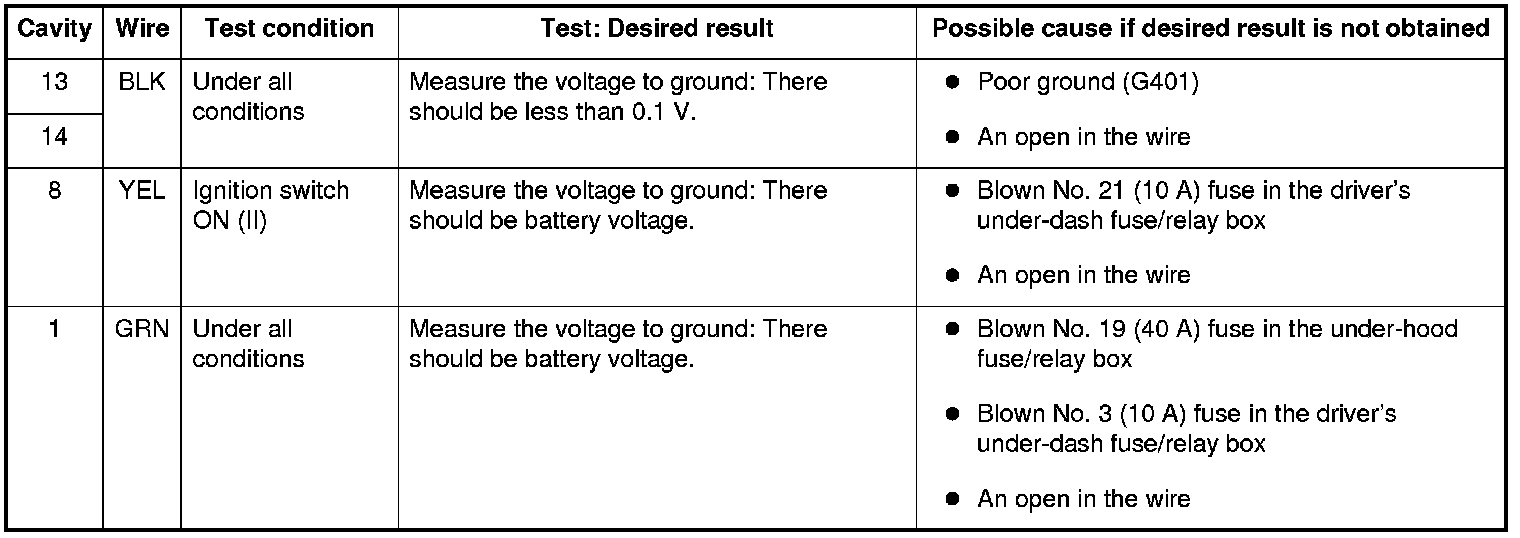 5. Disconnect the 14P connector from the daytime running lights control unit, and do these input tests at the connector.
