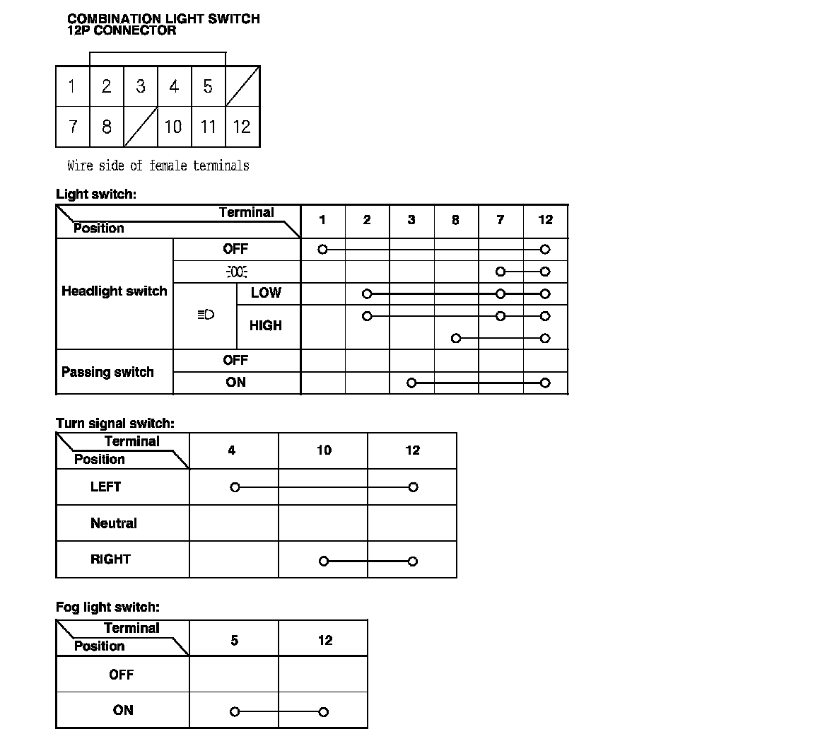 - If the terminals look OK, check for continuity between the terminals in each switch position according to the tables.