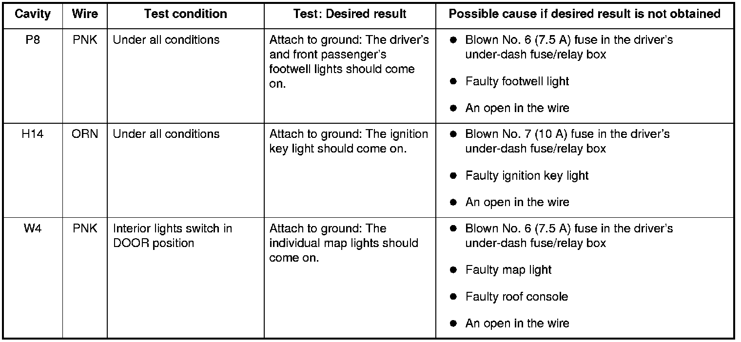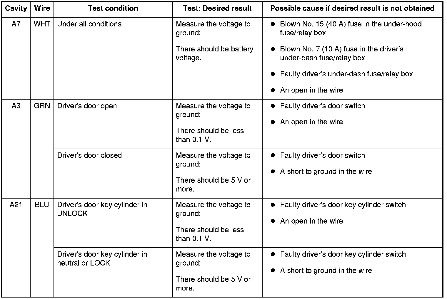 6. Reconnect the connectors to the driver's under-dash fuse/relay box, and do these input tests at the connectors.