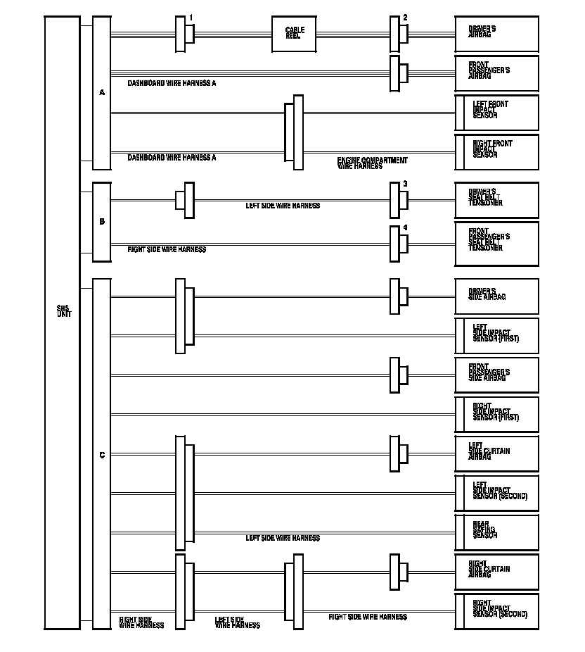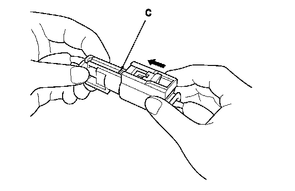 When SRS unit connectors A or C are disconnected, a short circuit is created in the connector by its own function to prevent airbag deployment. The circuit may need to be opened when diagnosis is done on the circuit. Insert the short canceller (No. 070AZ-SAA0100) in the specified cavities when it is necessary to keep the circuit open for diagnosis.