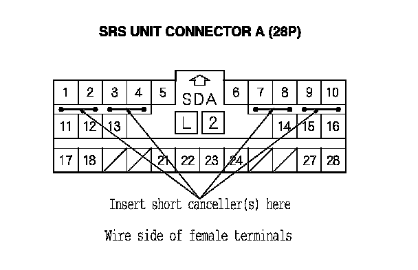 - To prevent damaging of the connector cavity, insert the SRS short canceller straight into the cavity from the terminal side.