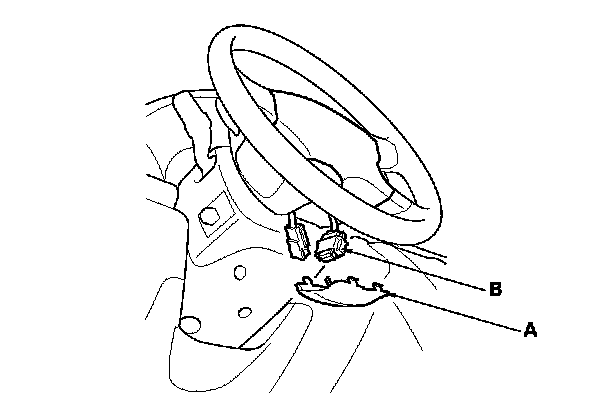 2. Remove the access panel (A) from the steering wheel, then disconnect the driver's airbag 4P connector (B) from the cable reel.