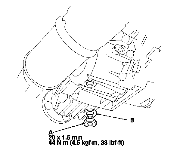4. Reinstall the drain plug with a new sealing washer (B).