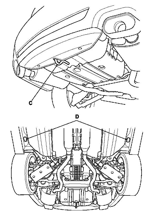 To accommodate flat-bed tow truck equipment, the vehicle is equipped with front towing hooks (A), front tie down hook slots (B), rear towing hook (C), and the rear tie down hook slots (D).