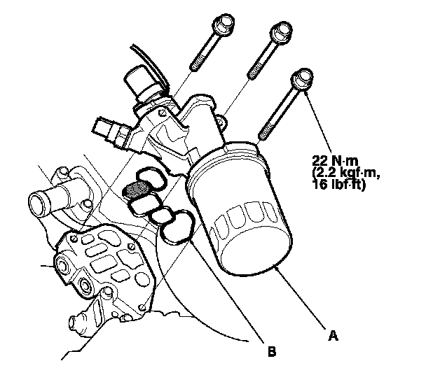 3. Remove the rocker arm oil control solenoid/oil filter assembly (A) from the oil pump, and check the rocker arm oil control solenoid filter (B) for a restriction. If there is a restriction, replace the rocker arm oil control solenoid filter, the engine oil filter, and the engine oil.