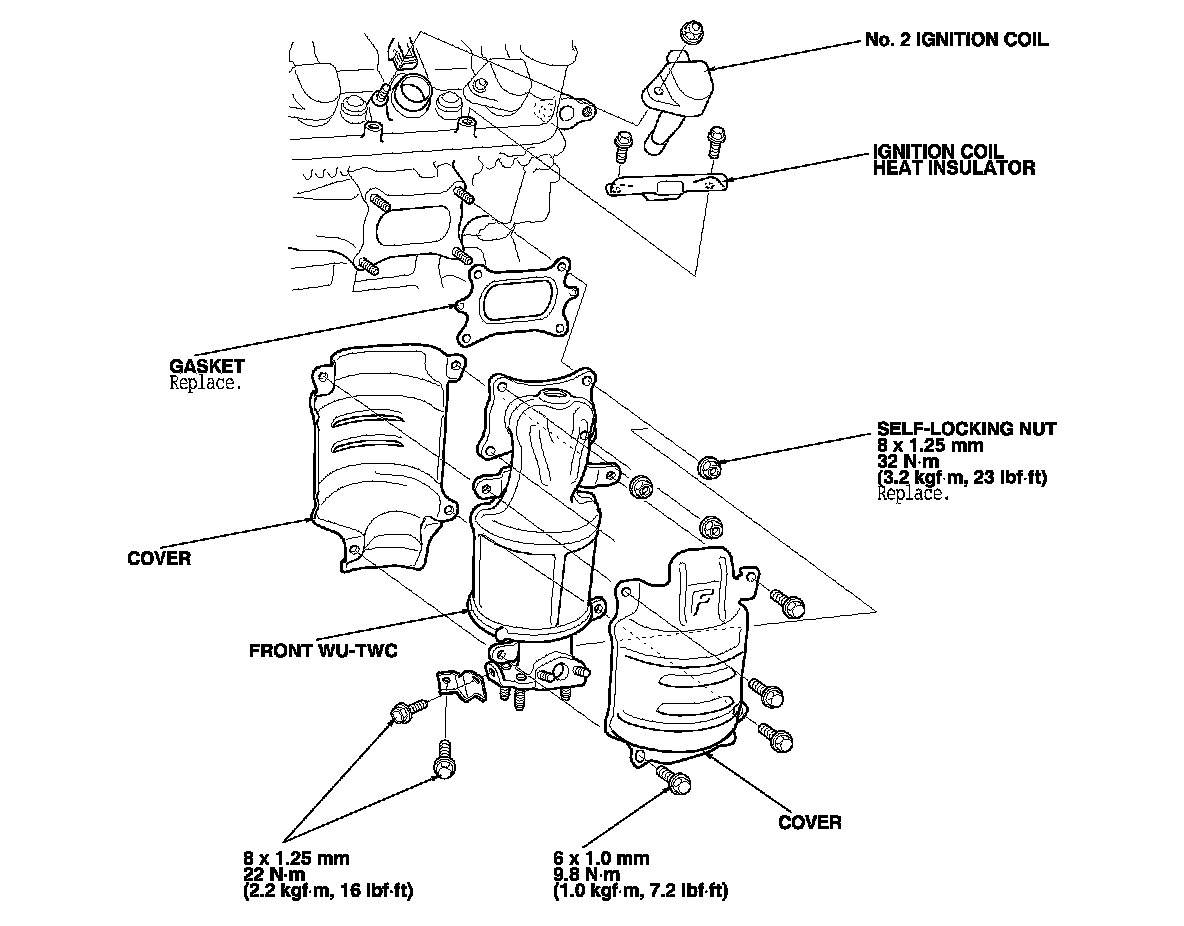 4. Remove the front A/F sensor (Sensor 1) A/F Sensor Replacement and the front secondary HO2S (Sensor 2). Secondary HO2S Replacement