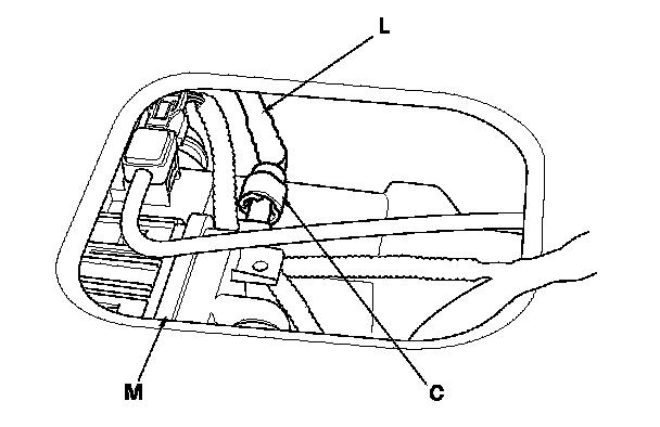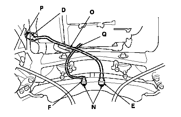 The fuel line/quick-connect fittings (A), (B), (C), (D), (E), and (F) connect the fuel joint hose (G) to the fuel feed hose (H), the fuel feed hose to the fuel hose (I), the fuel line (J) to the fuel tank unit (K), the fuel vapor line (L) to the EVAP canister (M), the fuel tank (N) to the fuel tank vapor recirculation tube (O), the fuel tank vapor recirculation tube to the fuel fill pipe (P), and the fuel tank to the fuel tank vapor control line (Q). When removing or installing the fuel feed hose, the fuel tank unit, or the fuel tank, it is necessary to disconnect or connect the quick-connect fittings.