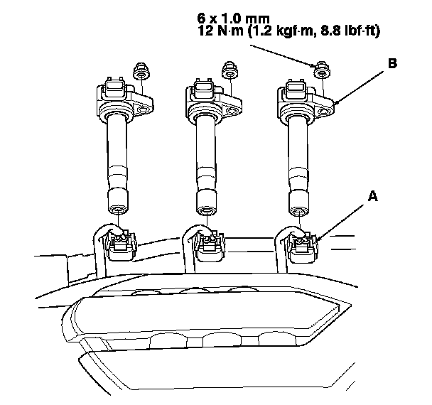 4. Disconnect the ignition coil connectors (A), then remove the front ignition coils (B).