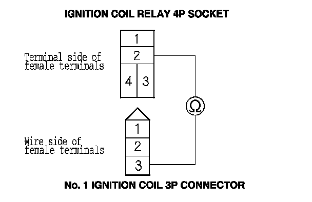 4. Check for continuity between ignition coil relay 4P socket terminal No. 2 and the No. 1 ignition coil 3P connector terminal No. 3.
