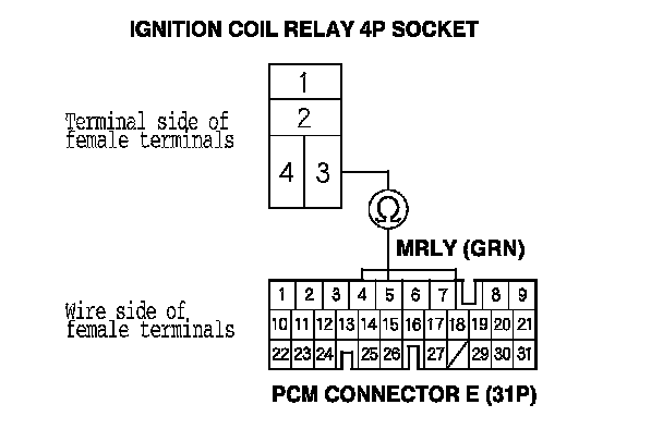 NO - Repair open in the wire between ignition coil relay 4P socket terminal No. 3 and the PCM (E5).