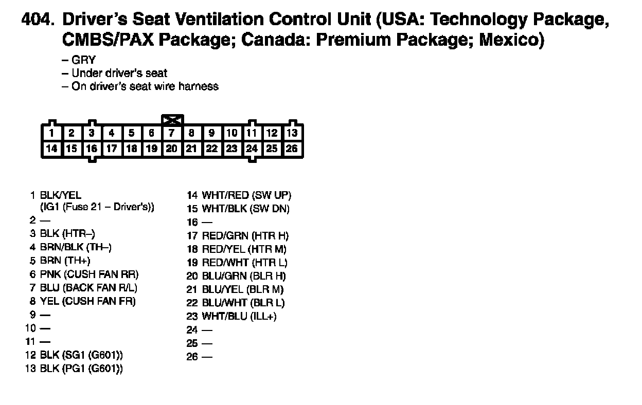 Driver's Seat Ventilation Control Unit Connector View (USA: Technology Package, CMBS/PAX Package)