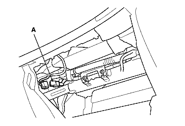 5. Remove the glove box, then disconnect the front passenger's airbag 4P connector (A) from dashboard wire harness A.