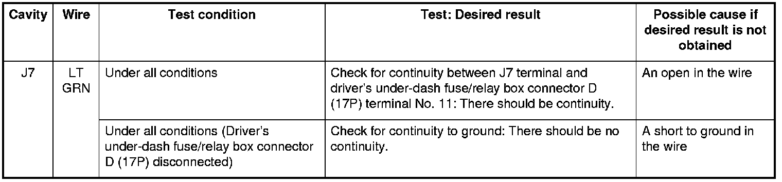 5. Disconnect under-hood fuse/relay box connector J (10P), and make these input tests at the connector.