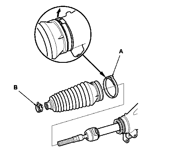 2. Remove the boot bands (A) and tie-rod clips (B). Pull the boot away from the ends of the steering gearbox.