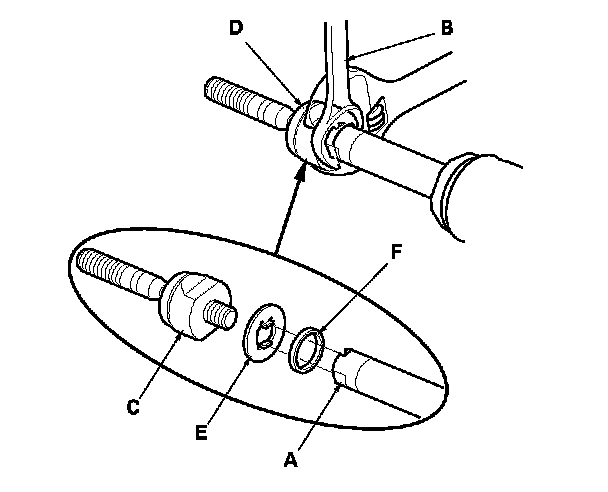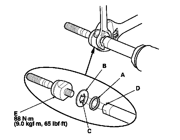 75. Install a new rubber stop (A) and a lock washer (B). Align the lock washer tabs (C) with the slots (D). Install the rack end (E) while holding the lock washer in place. Repeat this step for the other side of the rack.