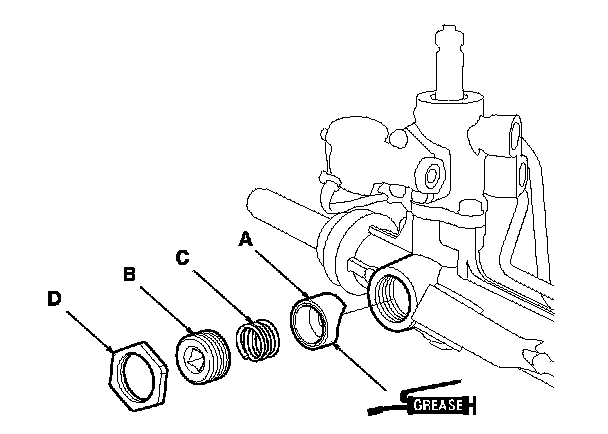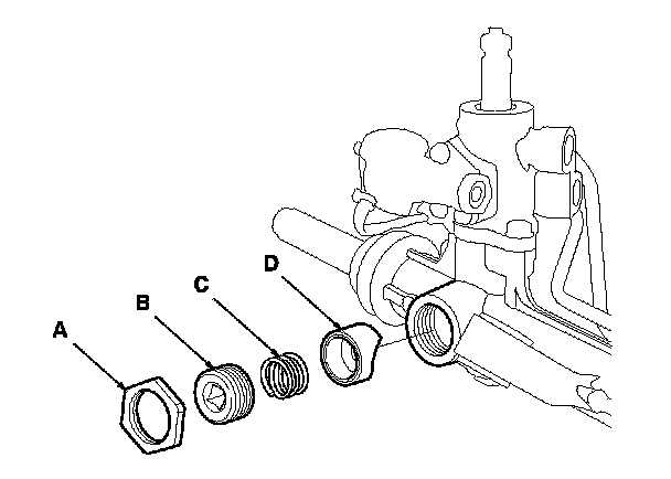 73. Apply new sealant (Three Bond 1141) all the way around the first three threads of the rack guide screw (B), then install the spring (C), the rack guide screw, and the locknut (D).