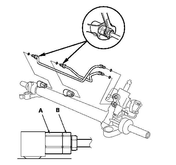 NOTE: Use a second wrench when loosening the cylinder lines to avoid damaging to the fittings on the steering gearbox. Do not loosen the A and B connectors.