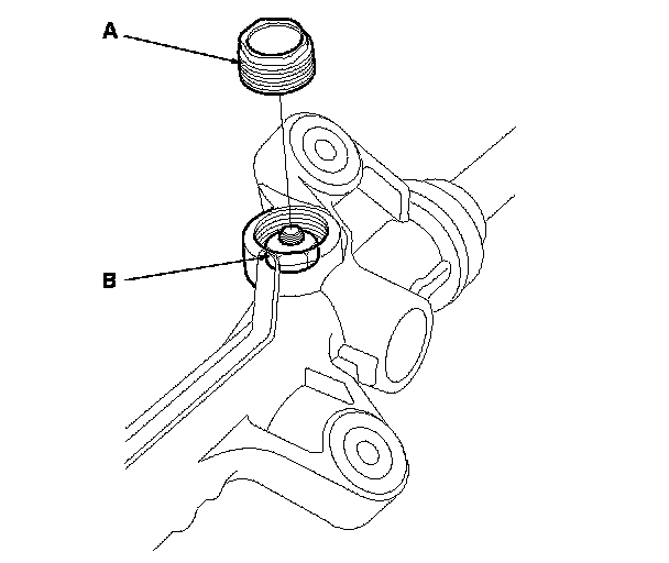 6. Loosen the locknut (A), then remove the rack guide screw (B).
