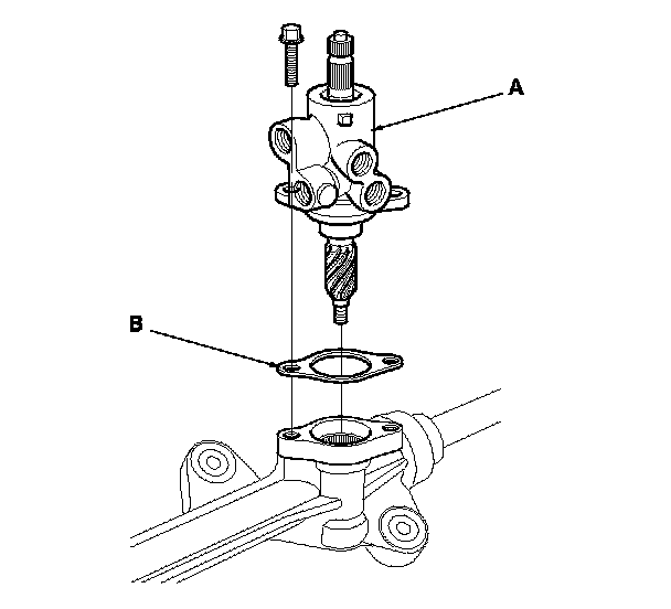 12. Remove the flange bolt, the valve body unit (A), and the gasket (B) from the gearbox. Check that the valve turns smoothly by turning the pinion shaft. If any play or roughness is felt, replace the valve body unit with a new part if necessary. Do not try to disassemble the valve body unit.