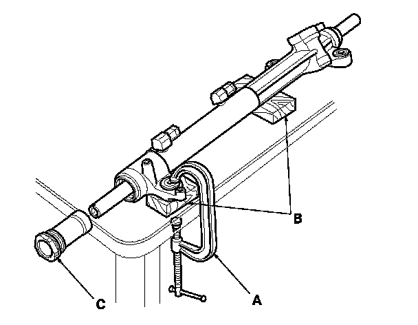 52. Install the new backup ring (A) on the steering rack, then place the backup ring and the cylinder end seal (B) against the piston (C).
