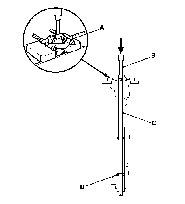 18. Set the steering gearbox in a press so the gearbox housing side points upward, then press the cylinder end seal (D) and steering rack out of the gearbox. Hold the steering rack to keep it from falling when pressed clear. Be careful not to damage the inner surface of the cylinder housing with the tool.
