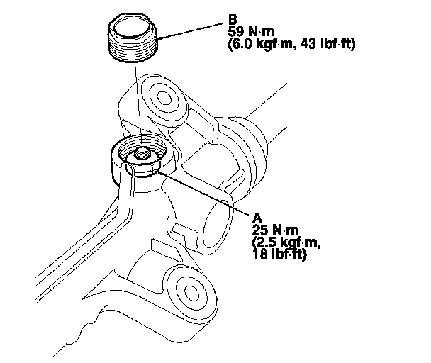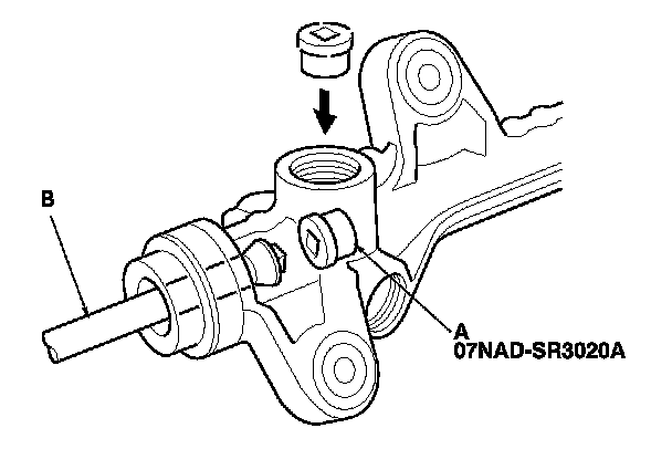 62. Coat the inside surface of the cylinder end (A) with power steering fluid, then install the cylinder end by screwing it into the cylinder (B). Tighten the cylinder end to the specified torque.