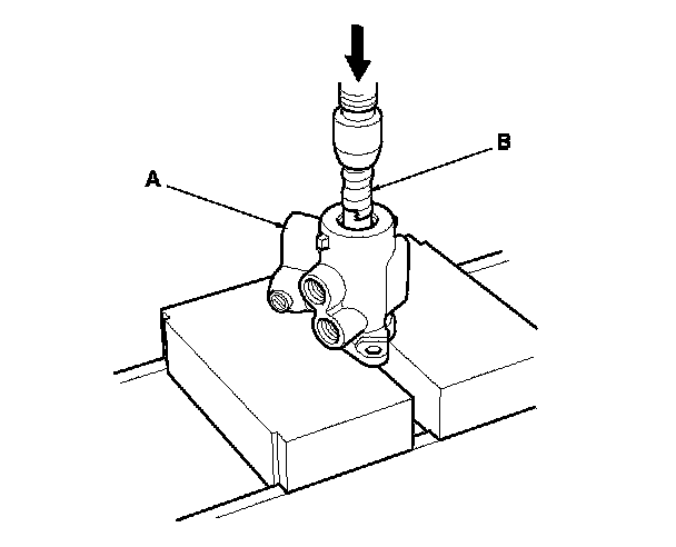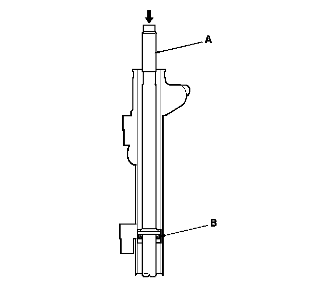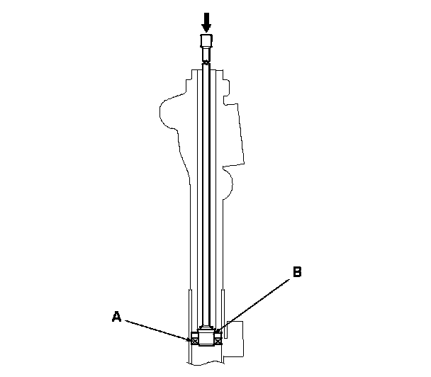 55. Install the cylinder end seal (B) into the bottom of the cylinder by pressing on the tool with a press. Do not push on the tool with excessive force as it may damage the cylinder end seal.